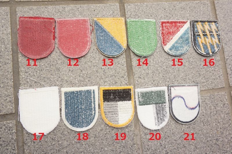 11.7th SFG(7th Special Forces Group 第7特殊部隊群):デッドストック新品ですが、保管時にベルクロと接触した関係で少し表面が傷んでしまっています。背面はアイロン接着シートになっているので、縫い付けずにアイロンでも取り付け可能です。82nd DIVARTY(82nd Airborne Division Artillery 第82空挺師団砲兵隊)および101st DIVARTY(101st Airborne Division Artillery 第101空挺師団砲兵隊)のベレーフラッシュも共通のようです。12の個体もほぼ同仕様となっております。