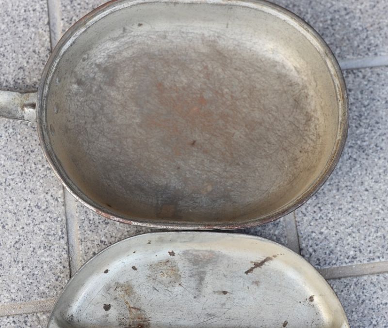 米軍のメスパンには縁がカーブしている製造品と縁がまっすぐの製造品が存在しますが、こちらは縁がカーブした製造品です。