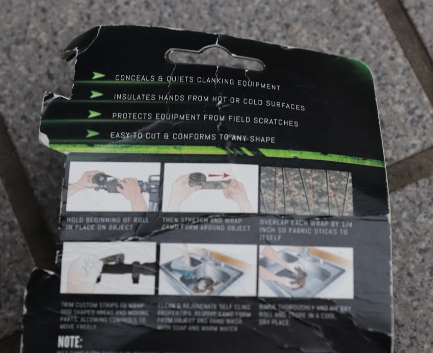 カモフォームは接着剤など不要でそのまま銃や光学機器に巻いて取り付けられるカモフラージュテープで、洗うことで接着力が戻るので、再利用も可能です。
