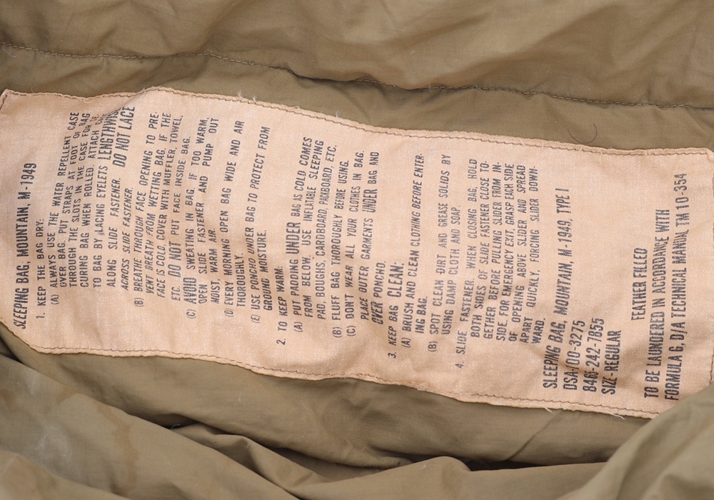 アメリカ軍実物のM1949マウンテンスリーピングバッグ(SLEEPING BAG, MOUNTAIN, M-1949, TYPE I)です。