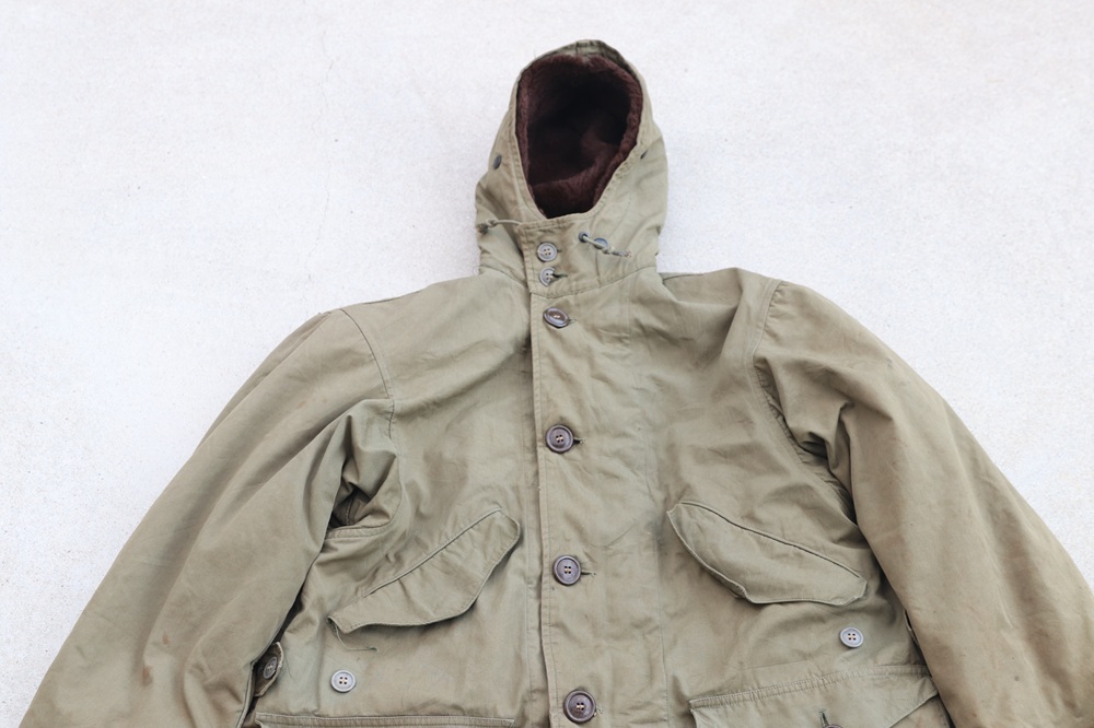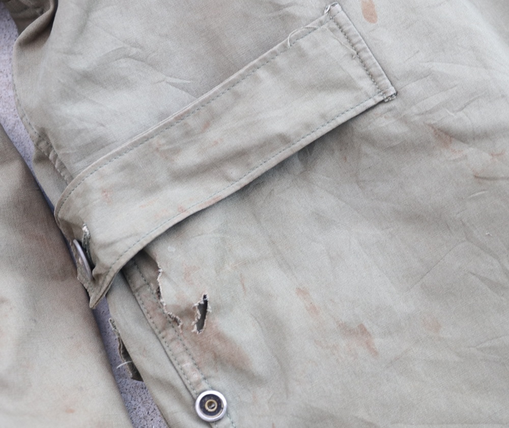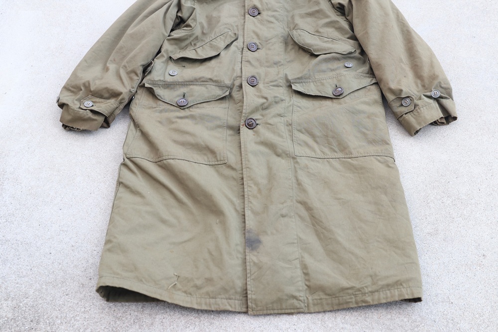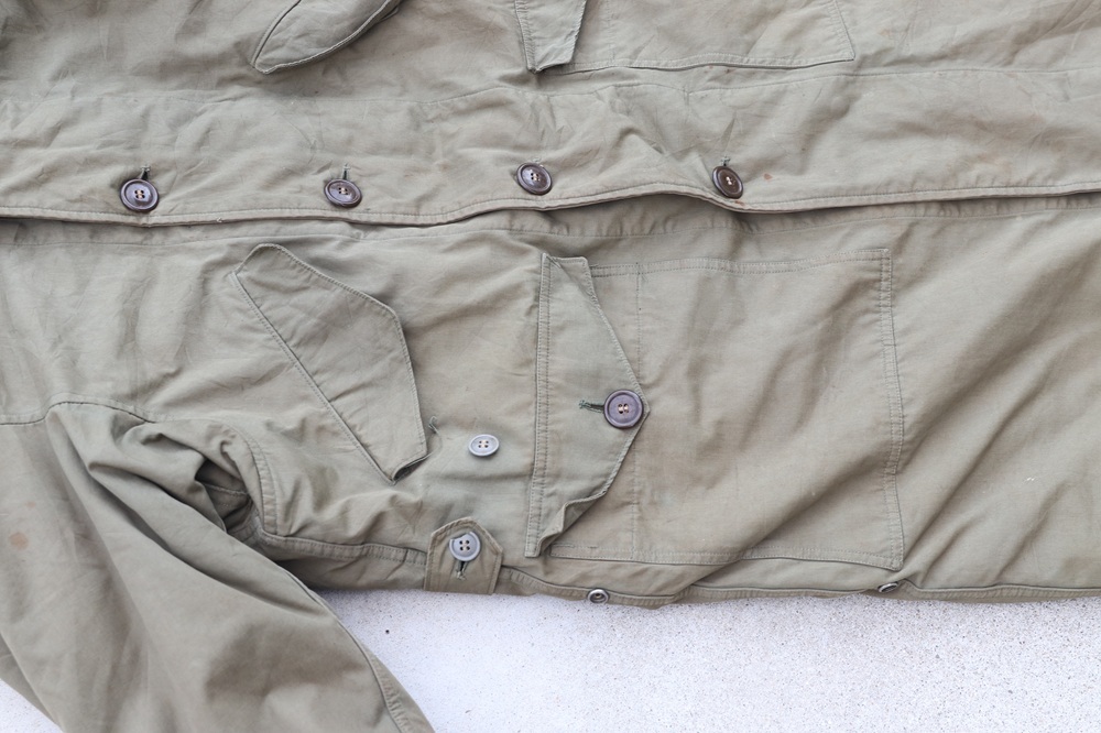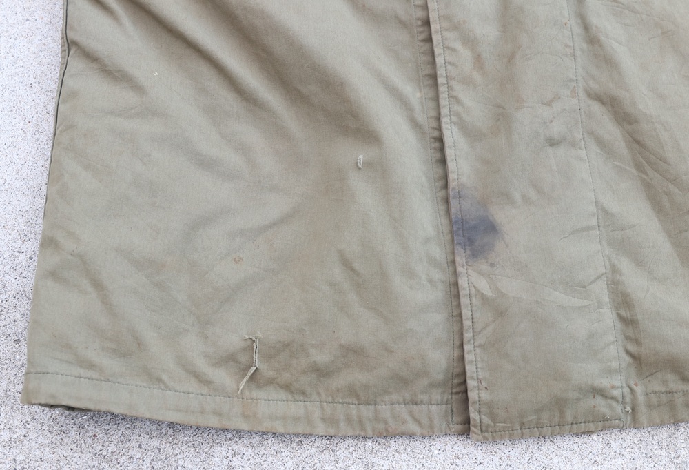 状態:中古。米軍実物放出品。各所にシミがあります。15枚目の写真のように背中側下部に補修があり、裾にすり切れがあります。16〜17枚目の写真のように左脇下と裾に破れがあります。ライナーに虫食い穴がある箇所があります。一部ボタンが割れています。破れは補修した方が良さそうですが、このまま実用可能な状態です。