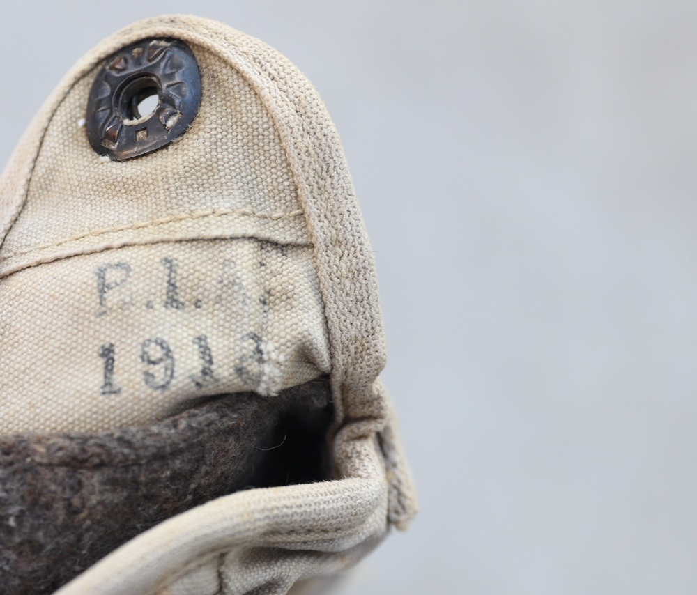 騎兵科用のキャティーンポーチで、コットン製のM1910キャンティーンカバーのようなダブルフックワイヤーがついていない構造です。