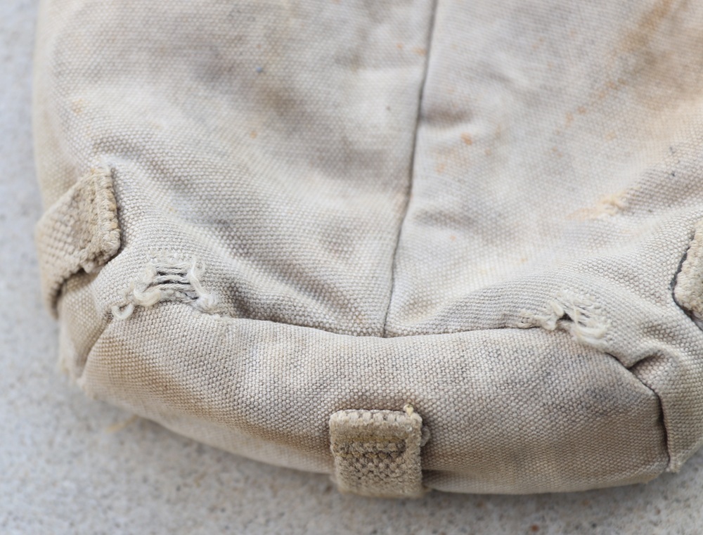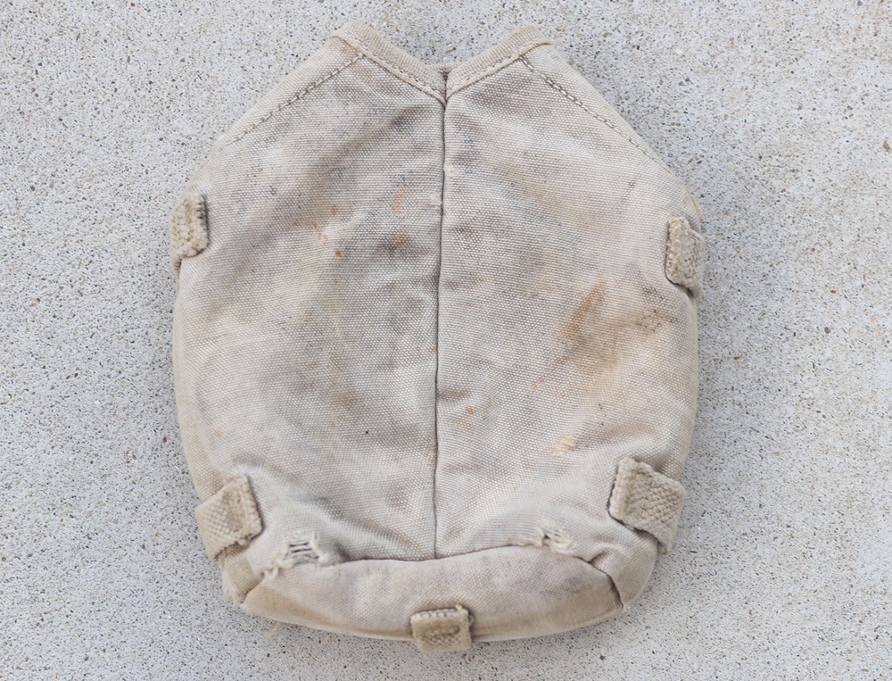 状態:中古。米軍実物放出品。かなり使い込まれており、表地に破れが複数あります。裏地は破れていません。表面に塗料が塗られている箇所があります。前述のように専用ストラップが付属していないので、このままでは使用できませんが、専用ストラップを取り付ければまだ使用できる状態です。