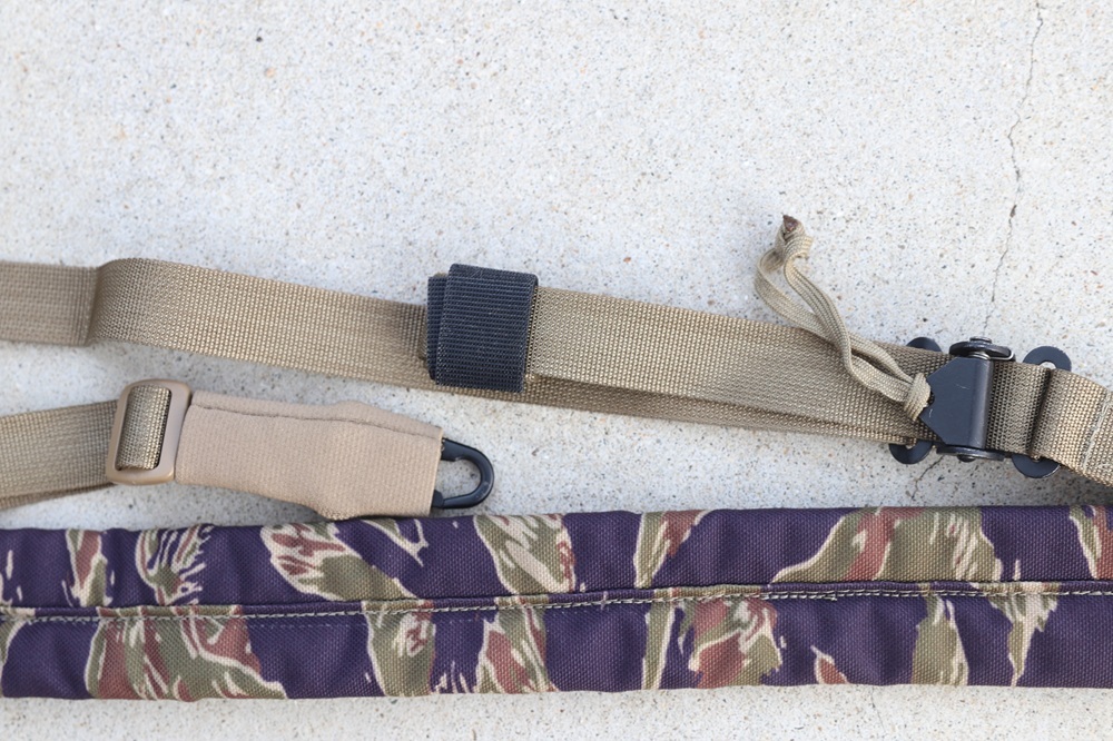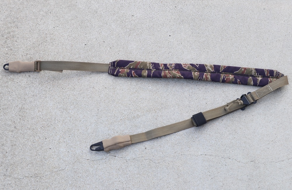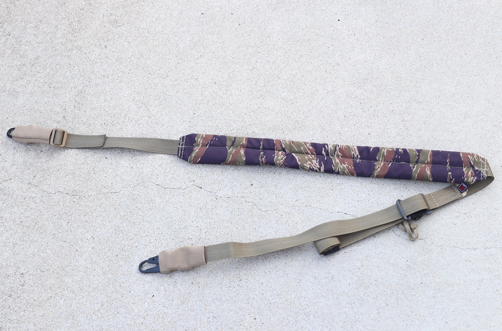 パッド付きの2点スリングで、両端のフックで銃などに取り付けて使用可能です。