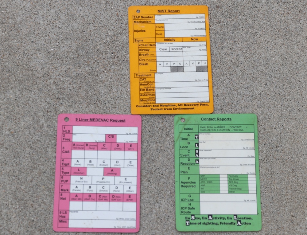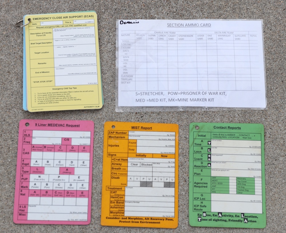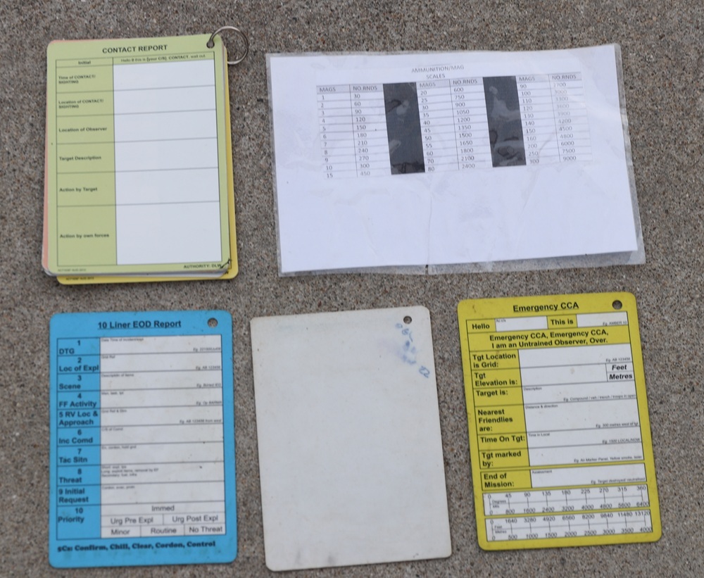 MIST(AT)REPORTが印刷されたカード、MEDEVACとMIST(AT)REPORTが印刷されたカード、10 LINER EOD REPORTとCONTACT REPORTが印刷されたカード、EMERGENCY CLOSE AIR SUPPORT(ECAS)とEMERGENCY CLOSE COMBAT ATTACK(ECCA)が印刷されたカード、COMMANDER'S CARDと2IC'S CARDが印刷されたカード、STAP CARDとBOMBREPが印刷されたカード、FIRE MISSION - CALL FOR FIREとSITREPが印刷されたカードの7枚が1つのリングに閉じられています。