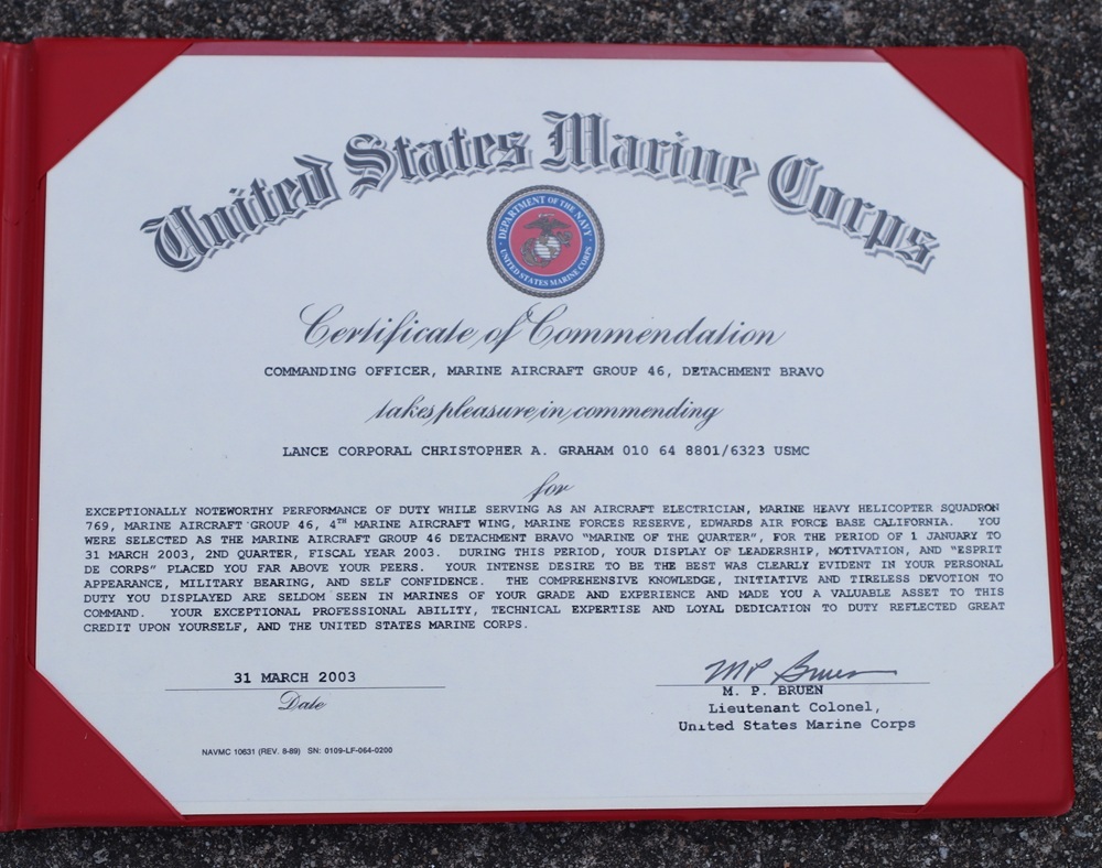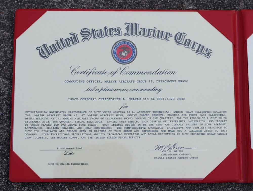 米軍 米海兵隊アルバム入り四半期最優秀海兵賞状