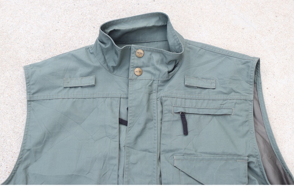 左肩にジッパー開閉式ポケット1つ、左胸にジッパー開閉式ポケット1つとベルクロ開閉式の縦長ポケット1つ、右胸にジッパー開閉式ポケット1つとベルクロ開閉式の横長ポケット1つ、正面裾にベルクロ開閉式ポケット2つとジッパー開閉式ポケット2つ、背中側上部ベルクロ開閉式の大型ポケット1つ、背中側裾にベルクロ開閉式ポケット2つ、内側にジッパー開閉式ポケット1つとペンポケット1つというポケット配置です。