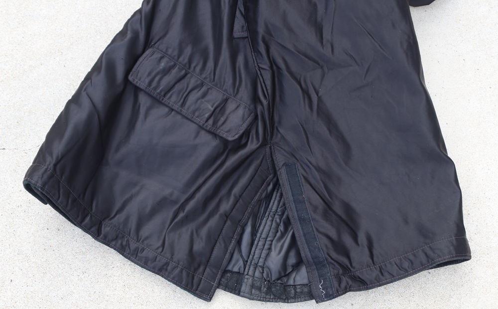 7枚目の写真のように裾の両側面はベルクロで開閉できる作りで、ベルトへ取り付けた装備品や下に着た被服のポケットへのアクセスが考慮されているようです。