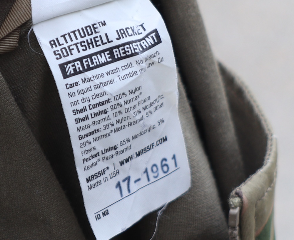 シェルは100%ナイロン、裏地は90%ノーメックス10%その他繊維、マチ部分が36%ナイロン31%モダクリル(Modacrylic)28%ノーメックス5%その他繊維、ポケットのライニングが95%モダクリル5%ケブラーで作られています。