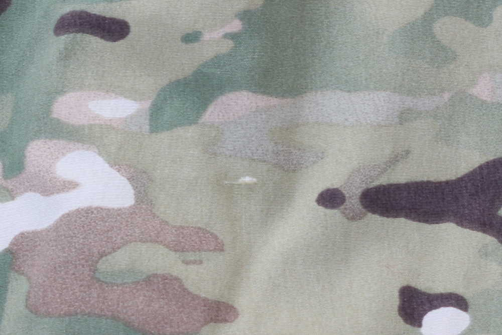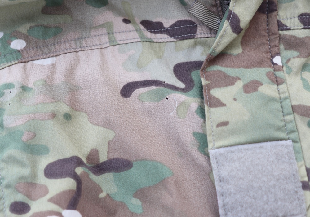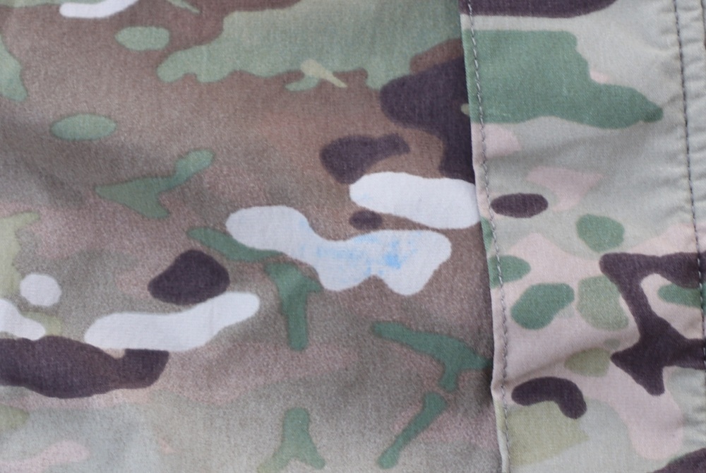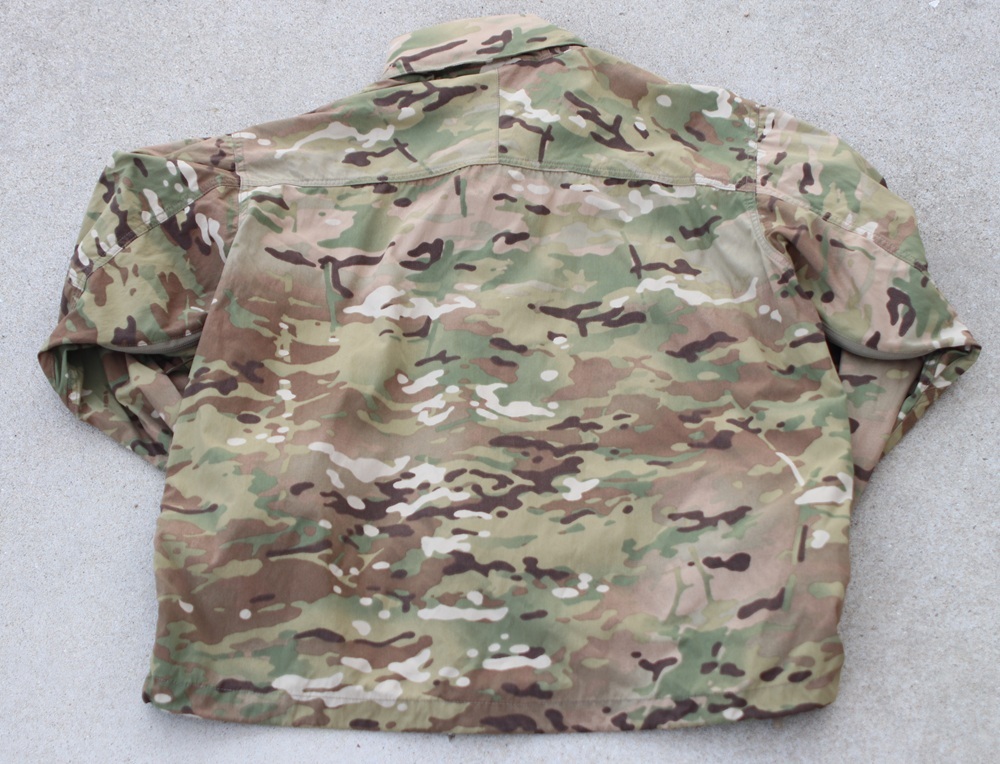 状態:中古。米軍実物放出品。9枚目の写真のように左袖のIRパッチ付きのタブのベルクロが少しほつれていますが、現状はこのまま使用できます。10枚目の写真のように右胸には本来ネームテープ用のベルクロが付いていますが、取り外されており、その跡がある状態です。11枚目の写真のようにシミのある箇所がありますが、迷彩に混じっていて、あまり目立ちません。12枚目の写真のように背中に小傷がありますが、現状はまだ破れにはなっていません。13枚目の写真のように裏地のメッシュ生地に毛立ちがでてきている箇所があります。その他使用感はありますが、このまま着用可能な状態です。